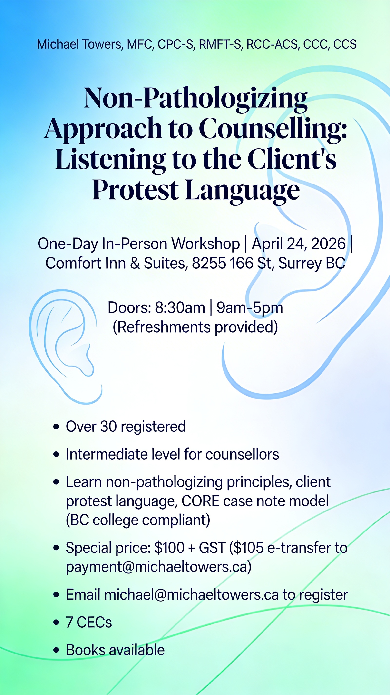 As an experienced clinical supervisor, Michael provides guidance to counsellors seeking to enhance their professional skills and navigate the complexities of therapeutic practice. Michael is also providing SOS (Supervision Of Supervision) services to help therapists become certified as a supervisor through BCACC.
